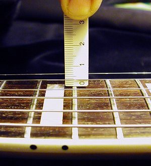 Per poter effettuare la regolazione della action (operazione che va eseguita con manico perfettamente a posto) occorre innanzitutto costruire un piccolo strumento di misura procurandosi un righello non trasparente e tagliarne una porzione come rappresentato nelle immagini. Procedere quindi alla regolazione come illustrato nella figura, agemdo sulle varie vitoìi del ponte, misurando l'altezza di ogni corda tra il bordo superiore del tasto e quello inferiore della corda stessa come rappresentato sotto.