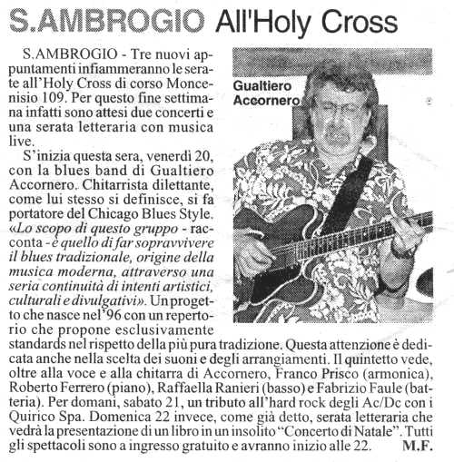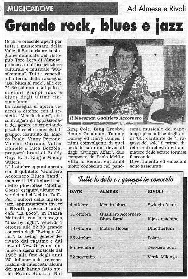 Gualtiero Accornero con la sua band si è esibito, oltre in feste private e varie manifestazioni di piazza (tra cui il Muovitipositivo in Piazza d'Armi a Torino) e in gran parte dei locali "storici" torinesi e dell'hinterland, tra i quali: L'Armadillo, Il Cammello, Morgan Pub, Rimba Club, Roll Play Cafè, Toro Loco, Mediterraneo, Il Magazzino di Gilgamesh, ecc.