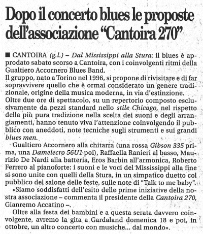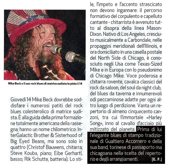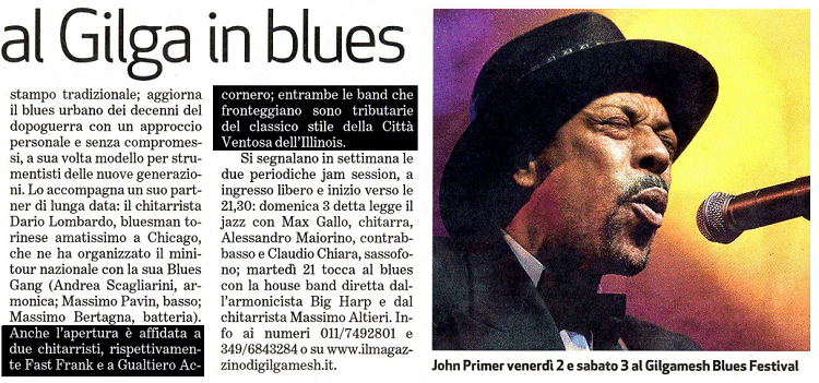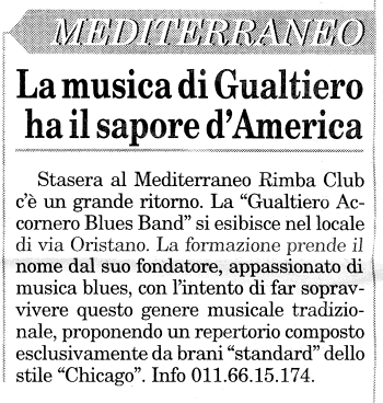 Si segnala la partecipazione alla 2a, 3a, 4a, 5a e 6a edizione del Blues Festival del Magazzino di Gilgamesh rispettivamente come opening act a diversi bluesman: Mike Beck, chitarrista di Chicago, Jake Walker The Ambassador of New York Blues chitarrista di New York, Sean Carney chitarrista di Columbus (Ohio), all'armonicista texano Memo Gonzalez e al famoso John Primer chitarrista di Chicago, leggenda vivente del blues. La band partecipa anche ad attività a carattere sociale tra cui si evidenziano concerti a favore dei terremotati di Haiti e dei rifugiati del Sudan. Gualtiero Accornero è anche impegnato in un discorso divulgativo per la diffusione della musica blues con conferenze-concerto e corsi, presso associazioni culturali, scuole e biblioteche Civiche, ecc. |