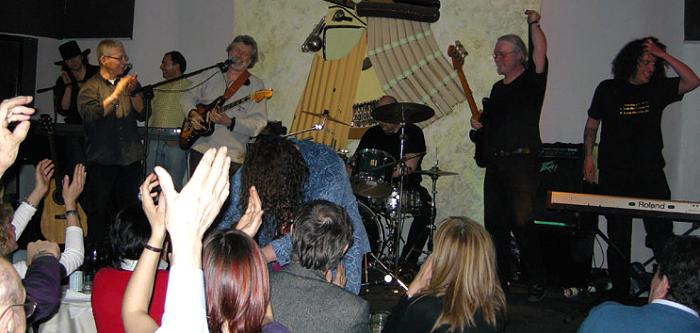 Mike Beck invita i solisti della nostra band sul palco per un gran finale inprovvisato sulle note del classico "Sweet home Chicago" (foto Francesco Ferrero). A sx: Mike Beck in azione sul palco del Gilgamesh (foto Francesco Ferrero). |