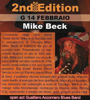 Con grande soddisfazione la Gualtiero Accornero Blues Band, essendo uno dei pochi gruppi musicali a suonare del blues tradizionale in Torino, è stata invitata a partecipare all'apertura al concerto del bluesman di Chicago "Chicago" Mike Beck che si è svolto nella sera di giovedì 14 febbraio 2008 (v. foto sotto). In fondo pagina ho riportato il manifesto dell'evento in cui compaiono i nomi dei bluesmen che si sono esibiti, le date e gli orari dei vari concerti.