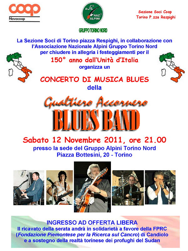 La COOP (Sezione Soci di Torino di piazza Respighi) in collaborazione con l’Associazione Nazionale Alpini Gruppo Torino Nord di piazza Bottesini 20 a Torino, per chiudere in allegria (...ma anche culturalmente) i festeggiamenti per il 150° anno dall’Unità d’Italia ha scelto di promuovere un concerto della Gualtiero Accornero Blues Band che ha accettato con entusiasmo di partecipare all'evento. Per la Blues Band è questa una ulteriore possibilità per divulgare la musica blues in ambienti diversi da quelli tradizionali in cui viene eseguito questo genere musicale.